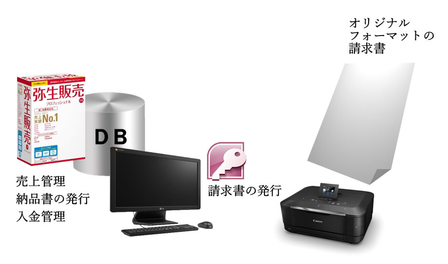 販売管理による売上伝票の入力と在庫管理、入金管理は弥生会計で行い、請求書の発行は、自社独自のフォーマットで出力したい場合に対応させた弥生販売対応させた請求書発行システムです。